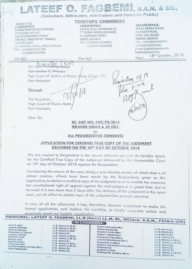 In a letter by Lateef O. Fagbemi, SAN, Counsel to the Respondents (Ojukaye Amachree-led EXCO) addressed to the Director (Litigation) and copied The Registrar, High Court of Rivers State, Fagbemi, SAN stated: “Considering the nature of the case, being a pre-election matter of which time is of utmost essence, efforts have been made by the Respondent, prior to this application, to obtain a certified copy of the judgement so as to enable her exercise her constitutional right of appeal against the said judgement in good time, but to no avail. It is now more than 7 days after the delivery of the judgement in the open court, yet all effort to obtain copy of the judgement has proved abortive.” (See the letter below).