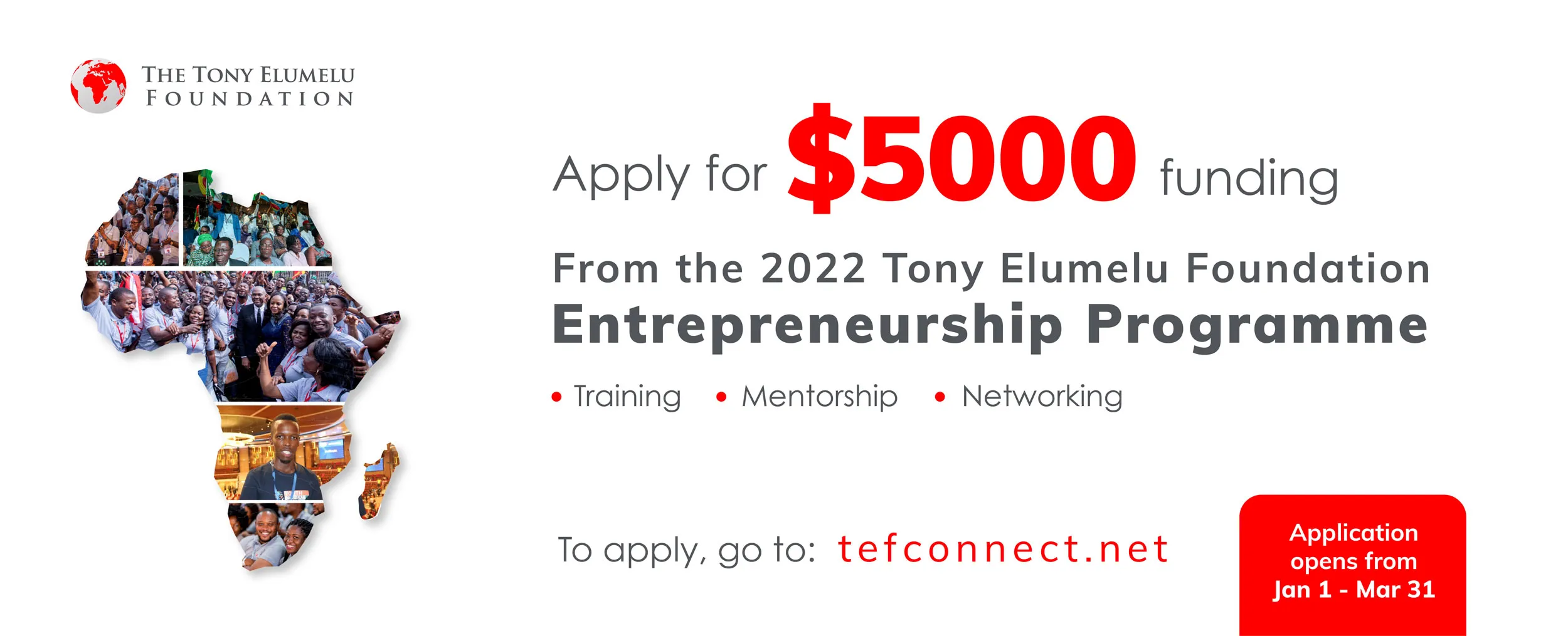 The Tony Elumelu Foundation (TEF) opens application portal for the 2022 Tony Elumelu Foundation Entrepreneurship $5000 Grant Programme from January 1.