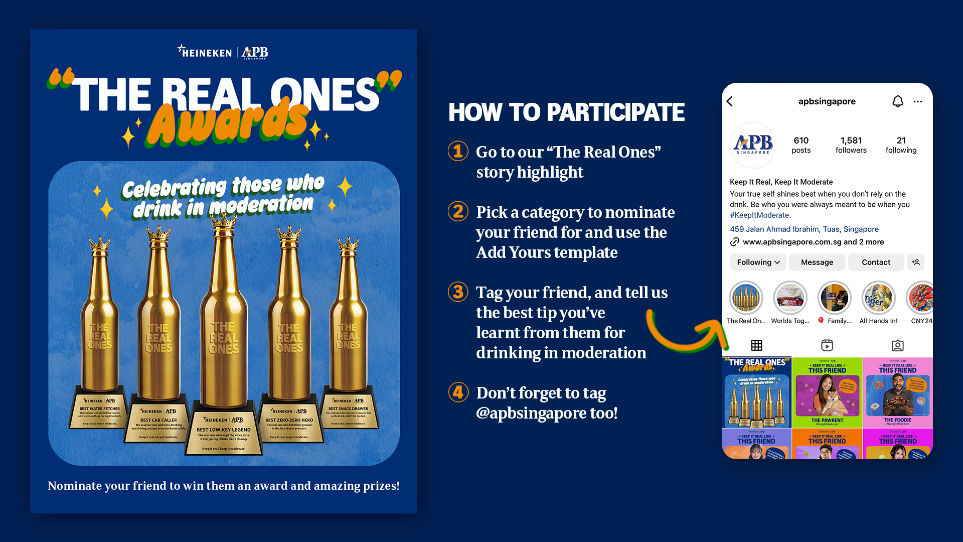 The 50 most inspiring stories, with 10 winners in each category, stand to win exclusive prizes including a custom trophy to honour their “Real One”, a $20 Grab voucher and a carton of Heineken 0.0 to toast to their authenticity. Nomination starts on the 20th of December and ends on the 3rd of January. Winners will be announced on 10th January on APBS’ Instagram.