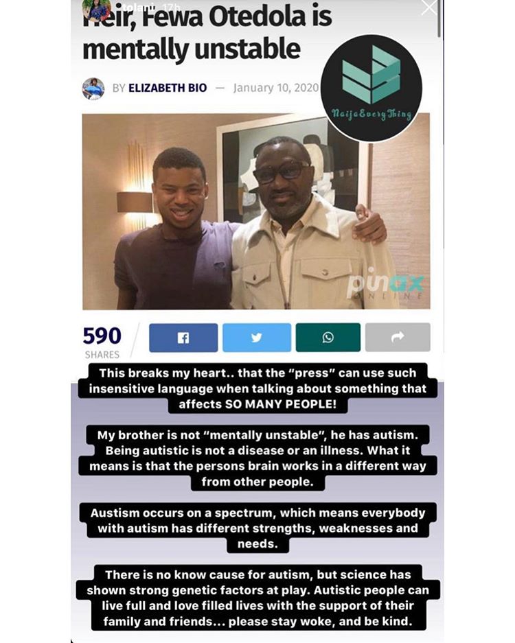 Femi Otedola‘s first daughter, Tolani has come out to cry out over the unfair label of her younger brother, Fewa, by the media.