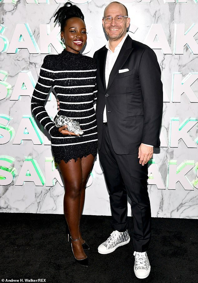 For the event, Lupita, 35, looked super hot in a long-sleeve, striped dress that matched perfectly with a tattered bottom and dark pumps with a silver strap design.
