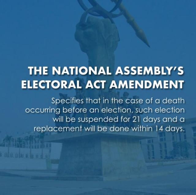 The Electoral Act amendment specifies that in the case of a death occurring before an election, such election will be suspended for 21 days and a replacement will be done within 14 days — the remaining the 7 days will be used for campaigning.