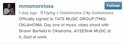 Nomoreloss, who is currently shooting a new music video in Oklahoma City which is being directed by Shawn Barfield, announced a new international deal on his Instagram, writing: ‘Officially signed to TATE MUSIC GROUP (TMG) OKLAHOMA. Day one of music video shoot with Shawn Barfield in Oklahoma…AYEESHA MUSIC at it…God at work.’