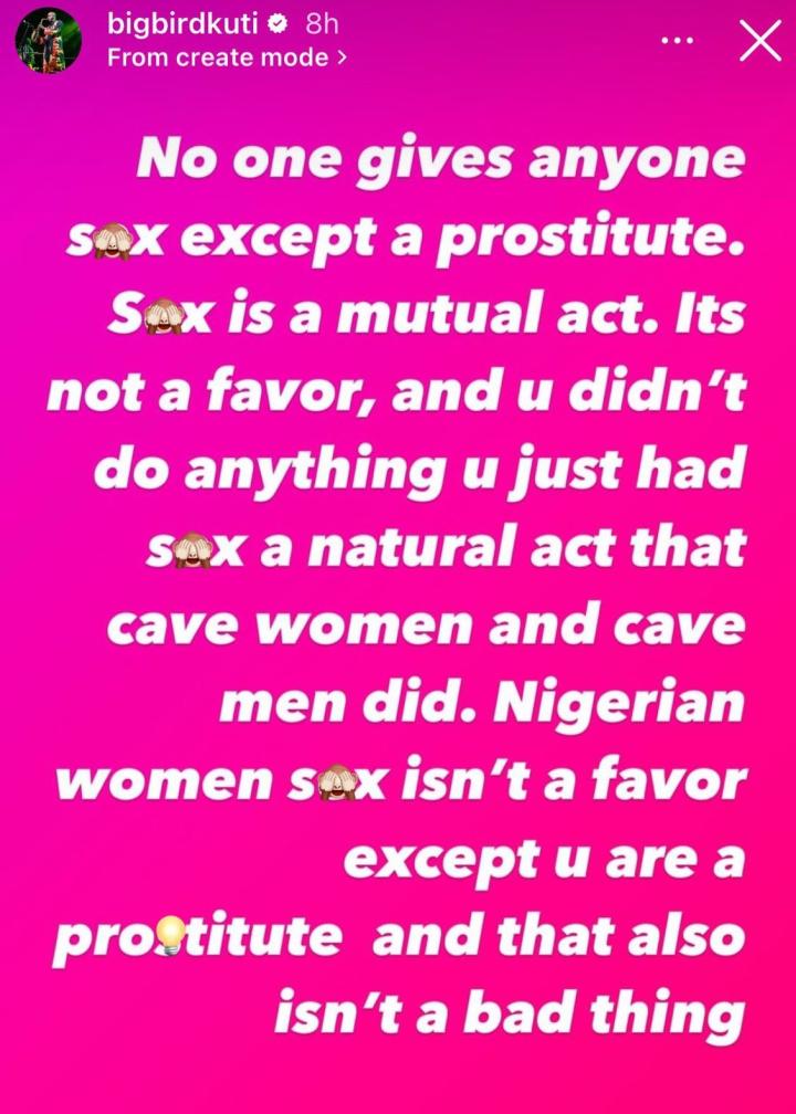 Seun added that s*xual intercourse is nothing but a mutual act that even cavemen and women engage in.