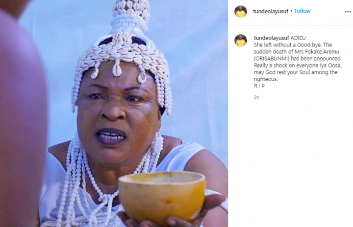 Veteran Nollywood actress, Folake Aremu, popularly known as Orisabunmi is dead. Her death was recently confirmed by the President of the Theatre Arts And Motion Pictures Practitioners Association of Nigeria (TAMPAN) Bolaji Amusan, known as Mr. Latin.